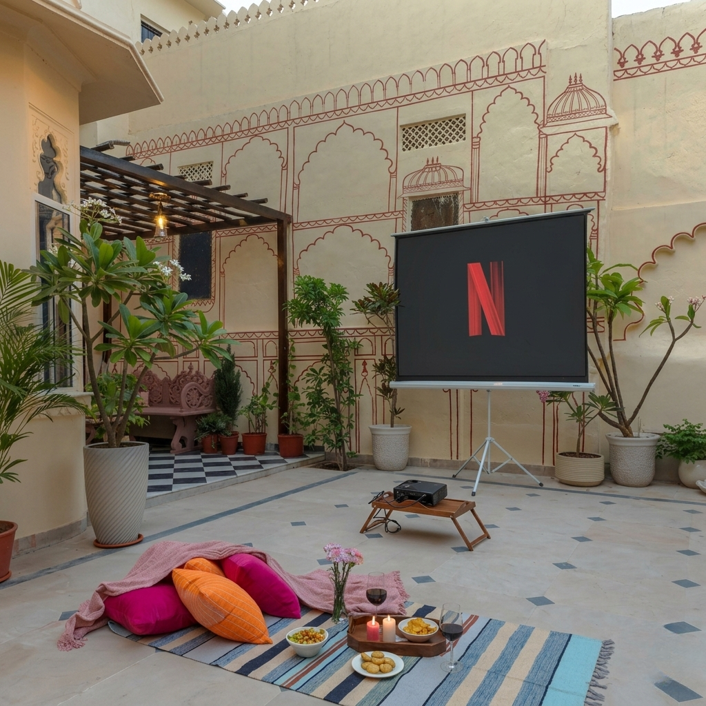 “Starry skies, ancient walls, and your favorite film—the ultimate Udaipur evening.”