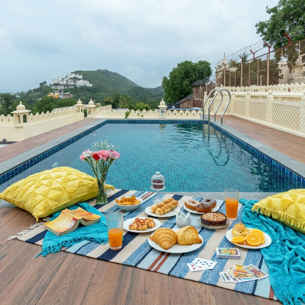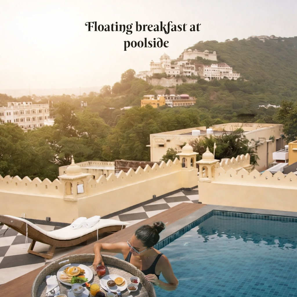 Start your day in a state of pure bliss. At Rang Haveli, we’ve taken the most important meal of the day and set it afloat. Imagine waking up to the soft morning light, stepping into the cool, crystalline waters of our rooftop pool, and having a gourmet feast drift toward you. With the Monsoon Palace as your silent morning companion on the hill, it’s a breakfast experience that feels like a dream.