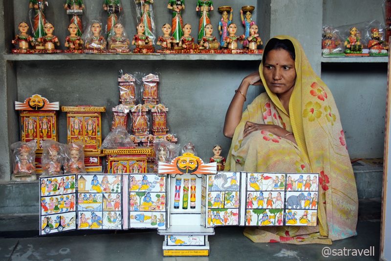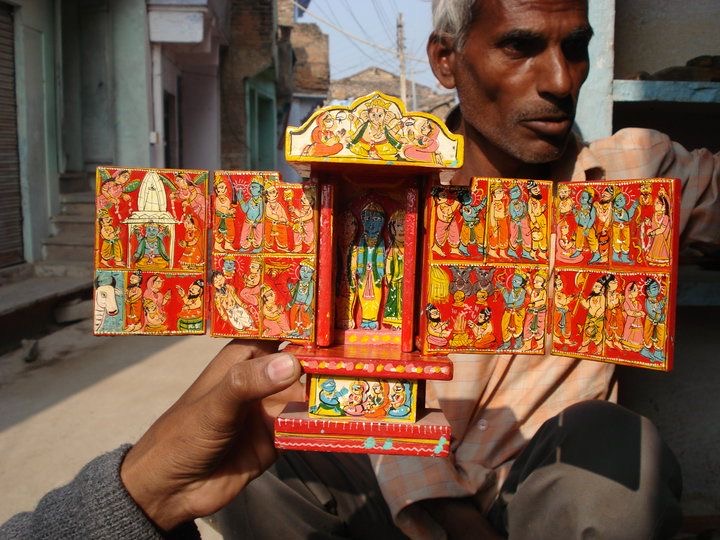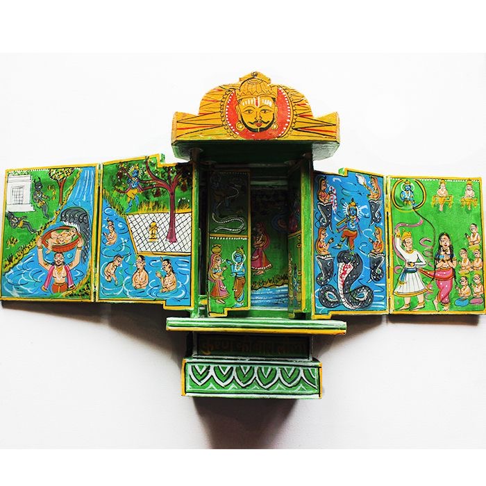 Kawads are handcrafted by the Suthar community of Bassi using traditional carpentry techniques. The structure is made from wood such as mango or semal and assembled with multiple hinged panels that open outward.