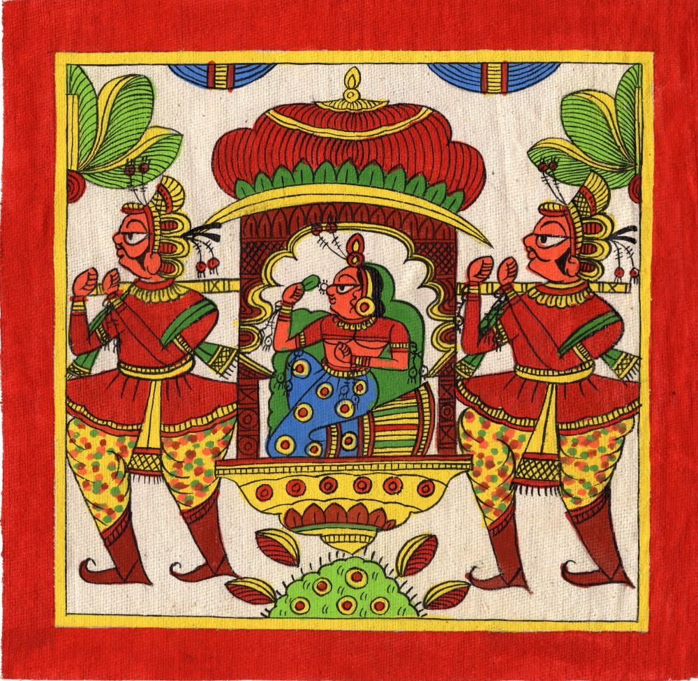Traditionally, Phad paintings were carried by priest-singers and unfolded after sunset. The word Phad comes from the local dialect meaning “fold,” referring to the way these scrolls were opened gradually as stories were narrated.