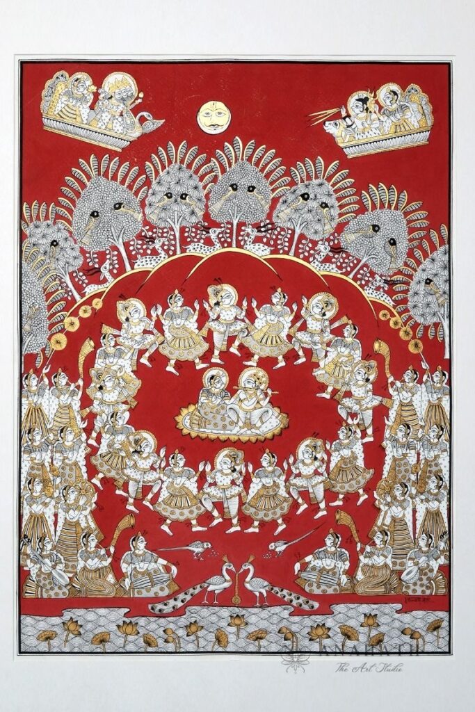 A distinctive feature of Phad Art is that the painted figures are flat and face each other rather than facing the viewer. This inward orientation reflects the idea of dialogue and storytelling within the artwork itself, rather than performance for an audience.