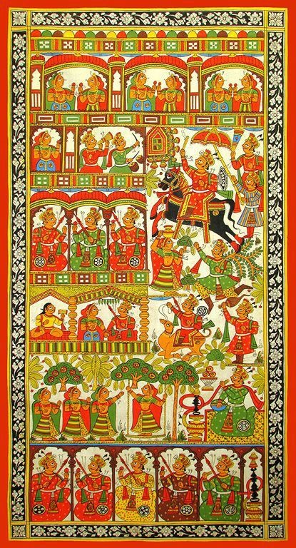 Phad Art is a traditional scroll painting that originated in Bhilwara, Rajasthan. These paintings narrate elaborate religious stories of local deities and gods, created as visual storytelling pieces rather than static artworks.